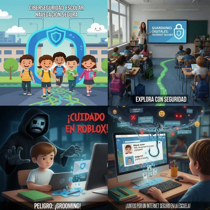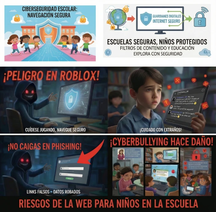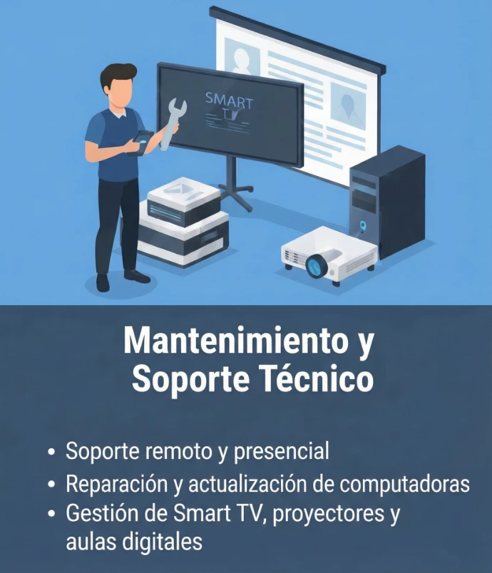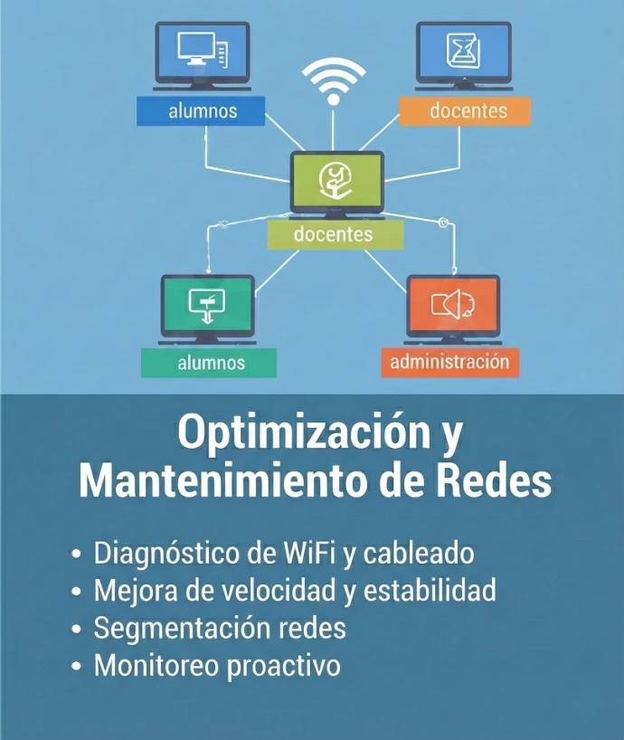 Soporte técnico, mantenimiento de redes y navegación segura para proteger a alumnos, docentes y directivos.