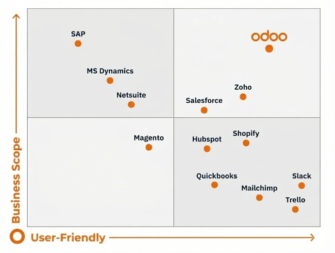 Odoo centraliza todo en una sola plataforma integrada: ventas, inventario, contabilidad, recursos humanos y más. Una solución completa que crece con tu empresa.